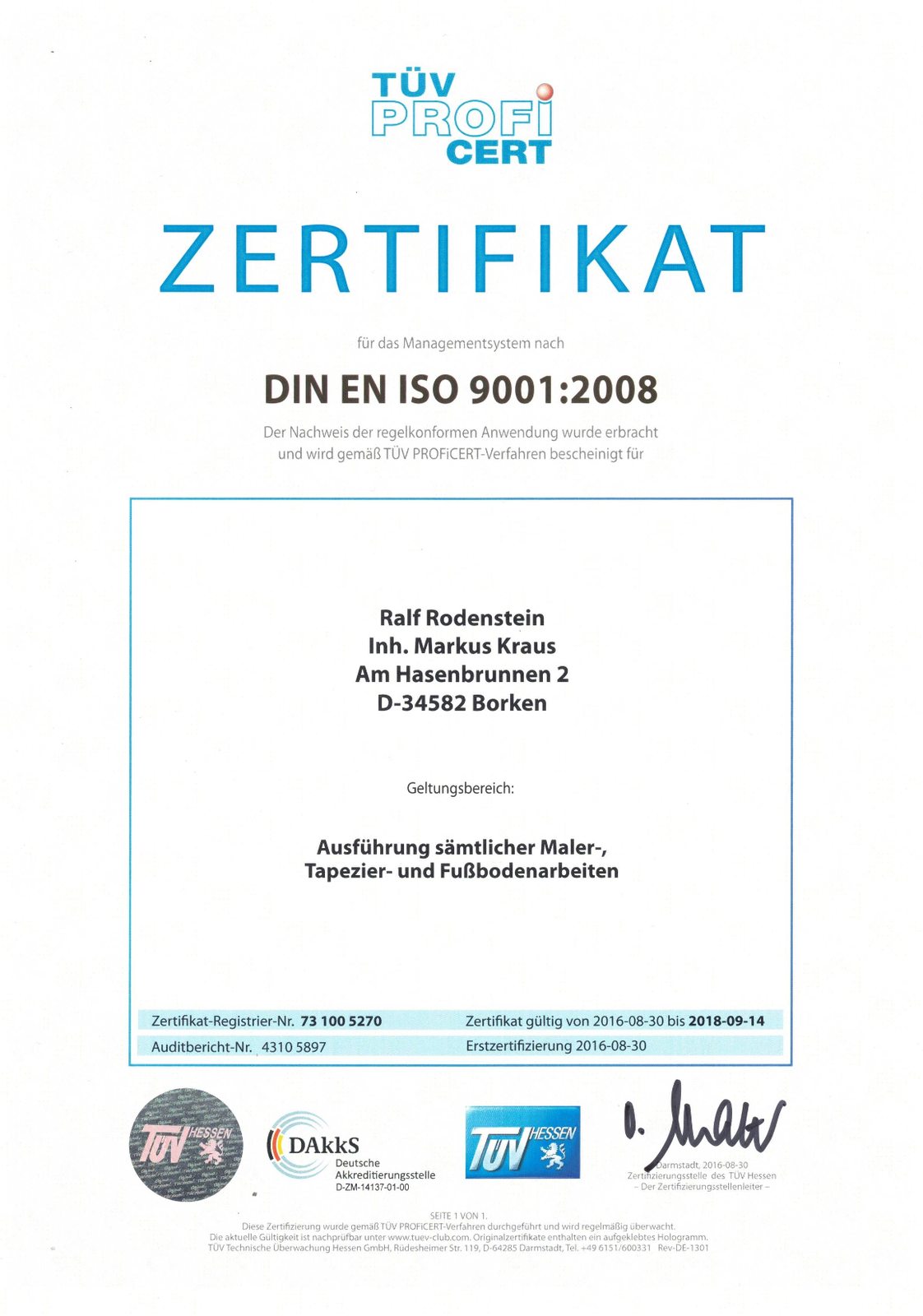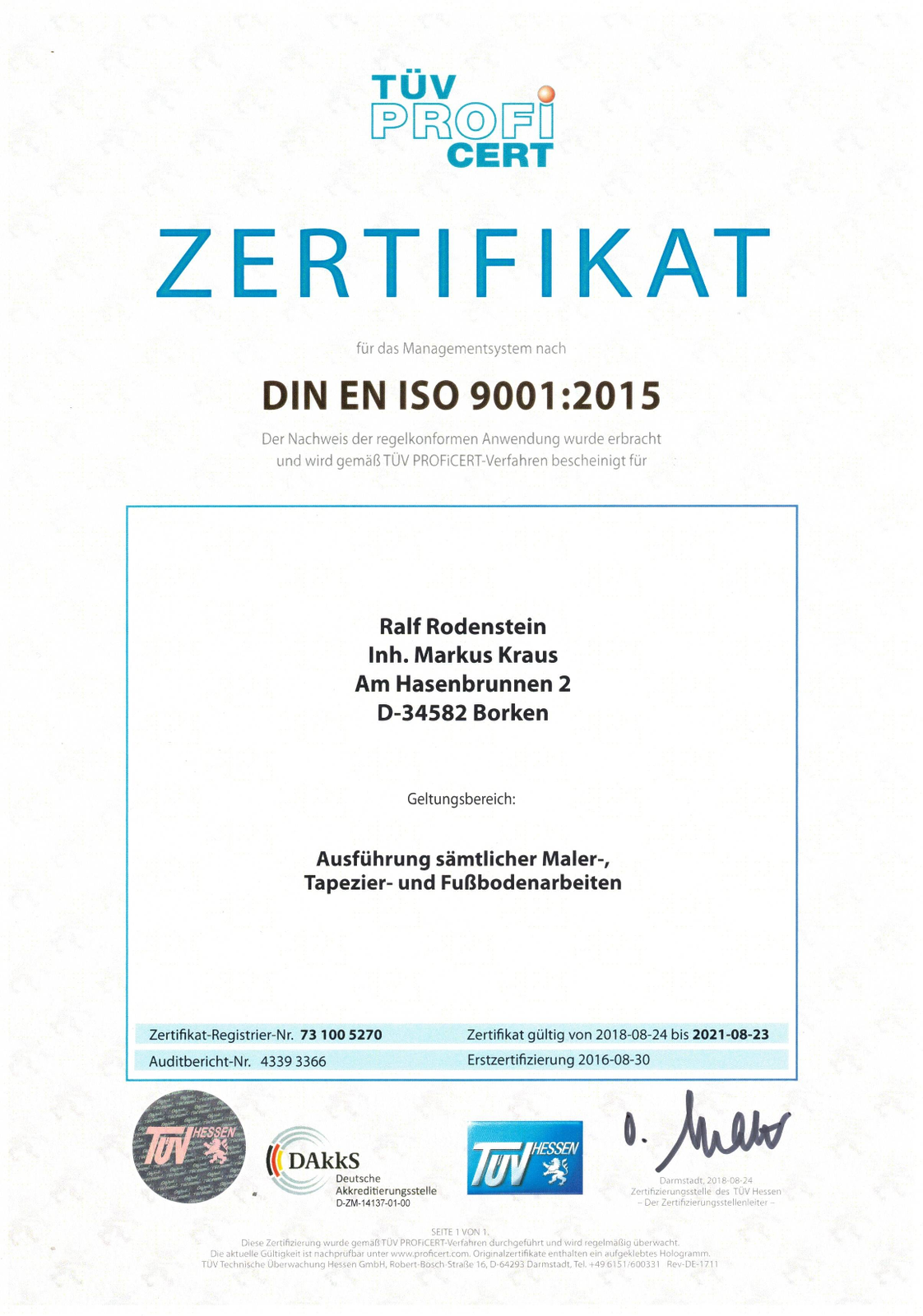 Seit 2016 sind wir ein zertifiziertes Unternehmen nach DIN EN ISO 9001 und werden jährlich vom TÜV überprüft. Das oberste Prinzip unserer Qualitätspolitik ist die Erfüllung der Kundenbedürfnisse im Hinblick auf Qualität, Preis, Lieferzuverlässigkeit und Service. Mittels der regelmäßigen Überprüfung und Anpassung der Qualitätsziele und des Qualitätsmanagements werden wir auch in Zukunft ein vertrauter und respektierter Partner für Kunden und Hersteller sein.